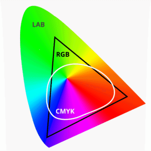 The chart illustrates the different gamuts of RGB and CMYK within the LAB color space, which covers the range of colors the human eye can perceive.